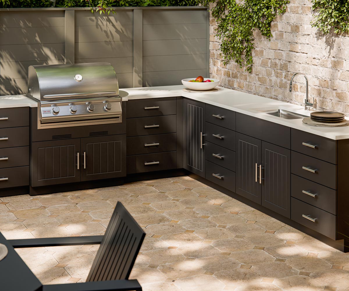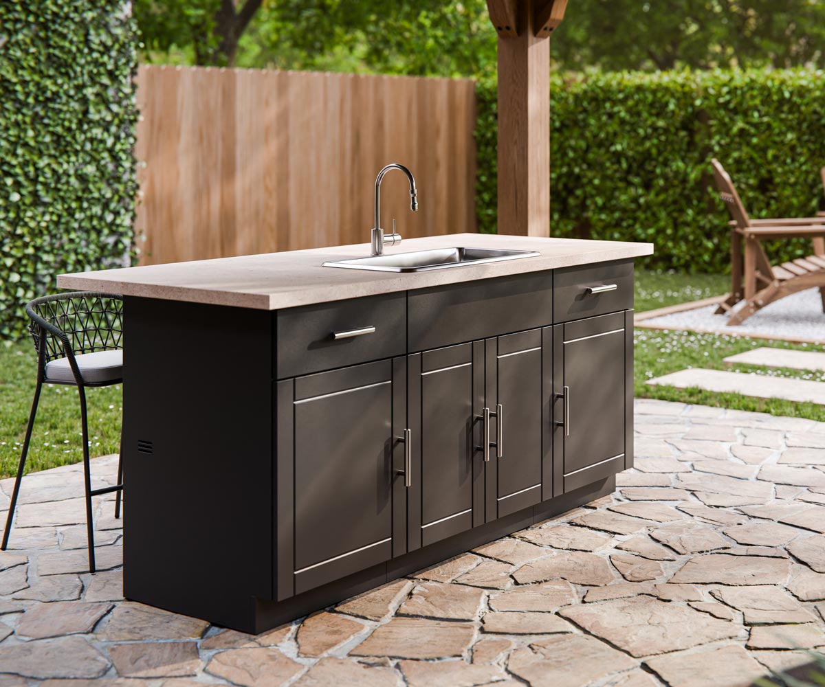 This poly outdoor kitchen is Amish-made in Ohio using time-tested woodworking techniques. The 5000 series can be customized with your combination of cabinets and drawers and is made with poly lumber for durability and sustainability. This modern style outdoor kitchen features stainless steel hardware and DIY assembly. Make this outdoor kitchen set your own by choosing from our selection of cabinet options.