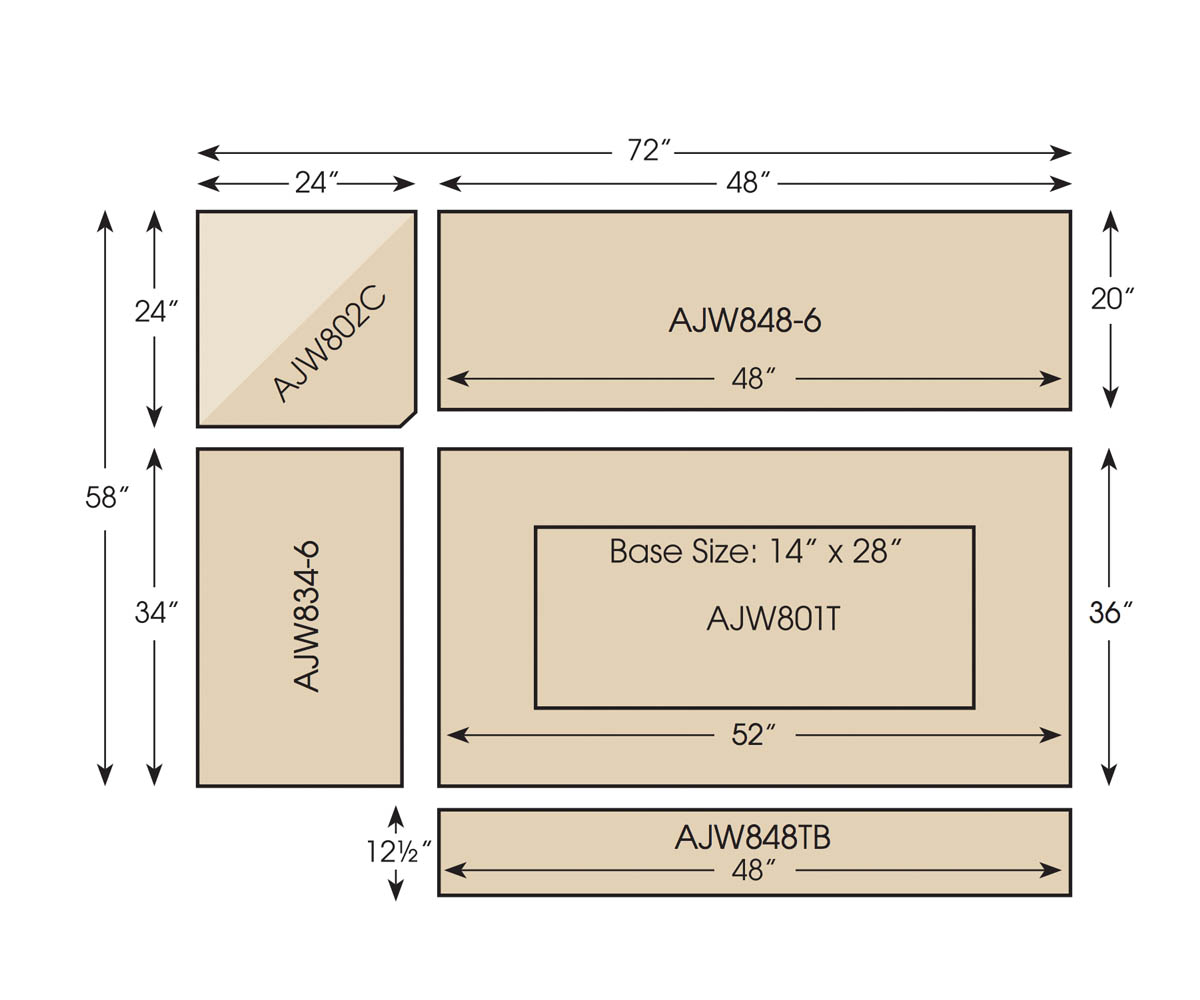 Dimensions: Table: 52″W x 36″D x 30″H Corner Bench: 24″W x 24″D x 33″H Right Side Bench: 48″W x 20″D x 33″H Left Side Bench: 34″W x 20″D x 33″H Backless Bench: 48″W x 12″D x 18″H